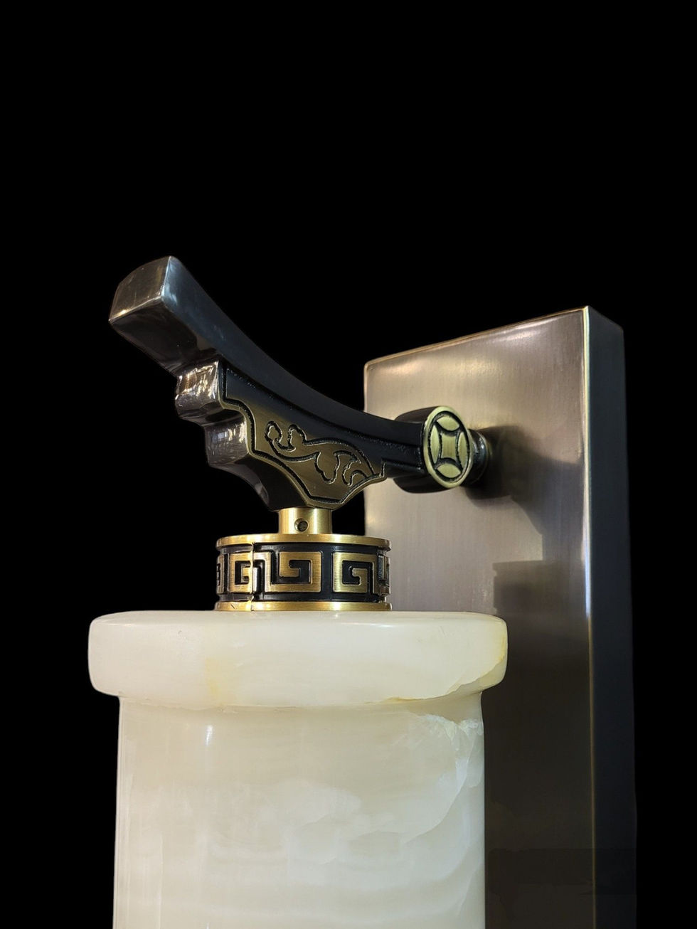 - Material: Crafted from durable metal with a gold finish and adorned with exquisite Onyx marble, meticulously chosen for its unique veining and translucence. The intricate details are accentuated by the elegant gold accents and the subtle, yet powerful, presence of the ancient Chinese symbol "Shou" (longevity), crafted in brass and delicately placed at each end.